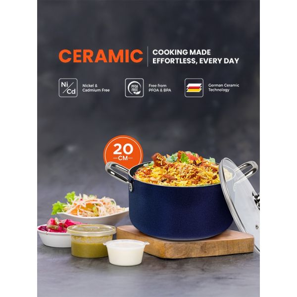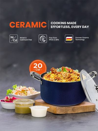HABITAT Ceramic Cookpot with SS Holo Handle & Glass Lid – 20 cm is a durable and versatile cookware essential designed for everyday cooking. The ceramic body ensures even heat distribution and a non-stick surface for healthier cooking, while the stainless steel holo handles provide a secure, heat-resistant grip. The tempered glass lid allows easy monitoring of your cooking without lifting the lid. Stylish, functional, and easy to clean, this 20 cm cookpot is perfect for soups, stews, and a variety of dishes.