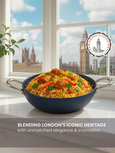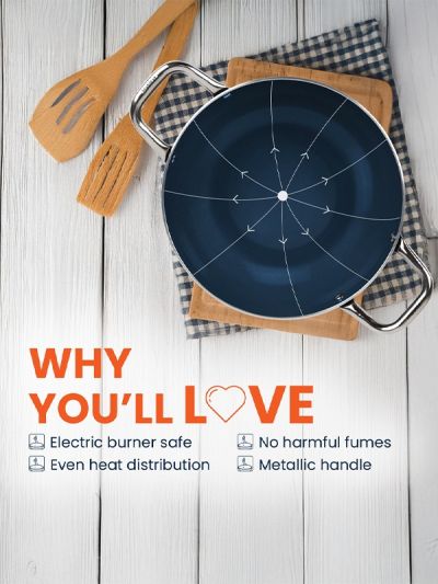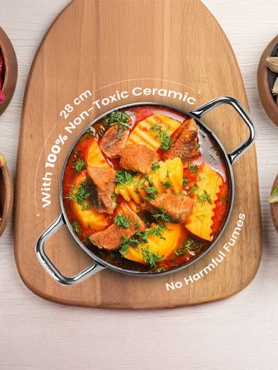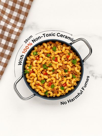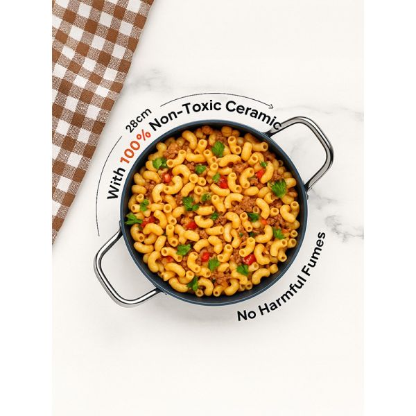 HABITAT Ceramic Kadai with SS Holo Handle & Glass Lid – 28 cm is a durable and versatile cookware essential for frying, sautéing, and preparing a wide variety of dishes. The ceramic body ensures even heat distribution and a non-stick surface for healthier cooking, while the stainless steel holo handles provide a secure, heat-resistant grip. The tempered glass lid allows easy monitoring of cooking without lifting the lid. Stylish, practical, and easy to clean, this 28 cm kadai is perfect for everyday cooking.
