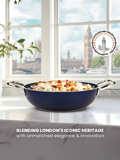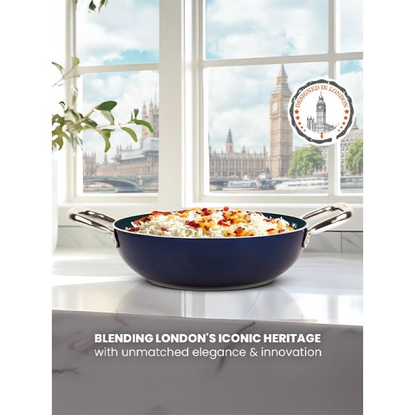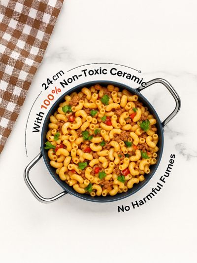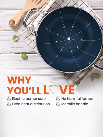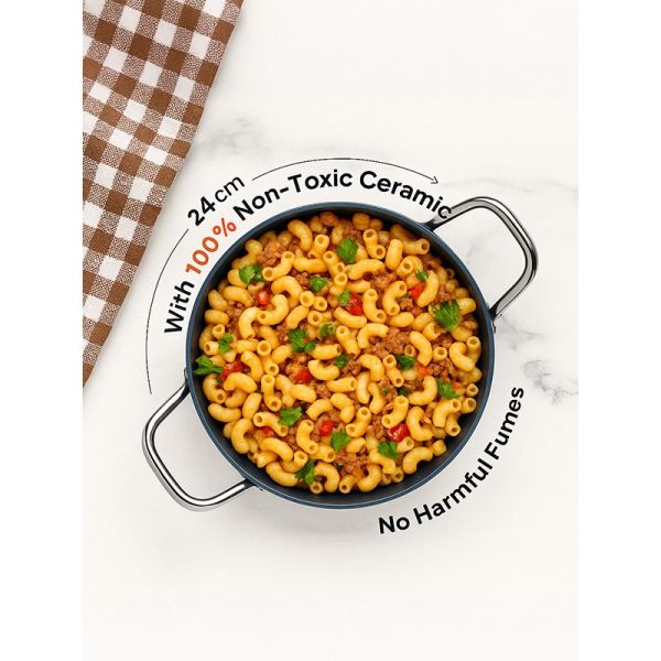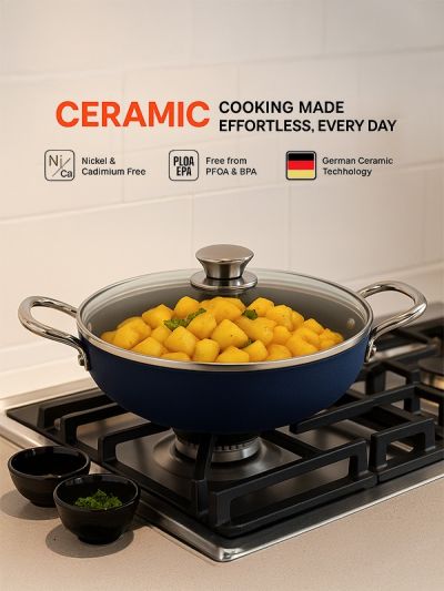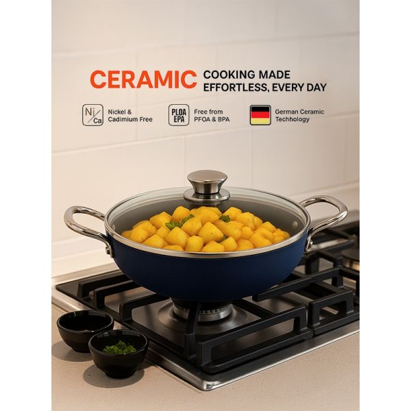 HABITAT Ceramic Kadai with SS Holo Handle & Glass Lid – 24 cm is a durable and versatile cookware essential for frying, sautéing, and preparing a variety of dishes. The ceramic body ensures even heat distribution and a non-stick surface for healthier cooking, while the stainless steel holo handles provide a secure, heat-resistant grip. The tempered glass lid allows easy monitoring of cooking without lifting the lid. Stylish, practical, and easy to clean, this 24 cm kadai is perfect for everyday cooking needs.