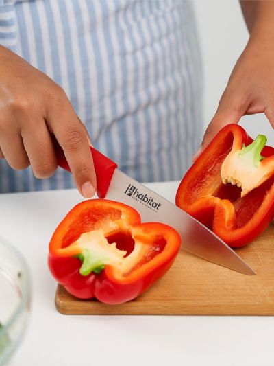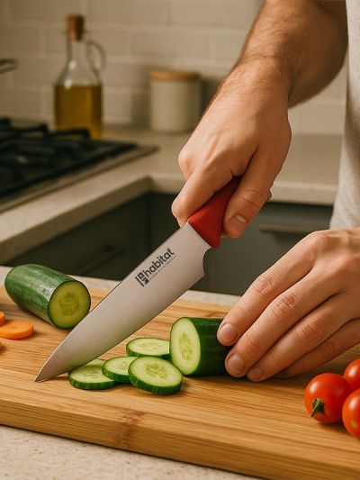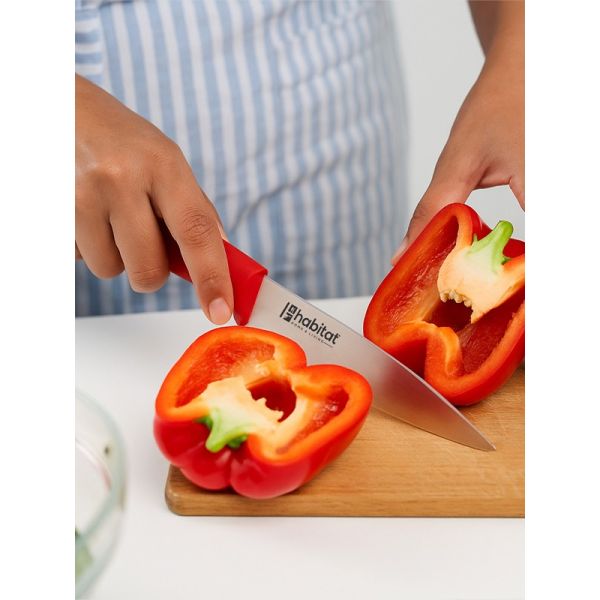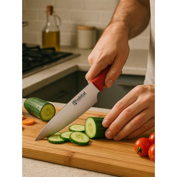 HABITAT 8" Chef Knife with PP Handle is a versatile all-purpose knife, perfect for chopping, slicing, dicing, and mincing a wide variety of ingredients. The stainless steel blade offers superior sharpness, durability, and precision, making it the ultimate tool for everyday kitchen prep. Its ergonomic polypropylene (PP) handle provides a secure, non-slip, and comfortable grip for safe and efficient use. Balanced, lightweight, and reliable, this chef knife is an essential companion for both home cooks and professionals.