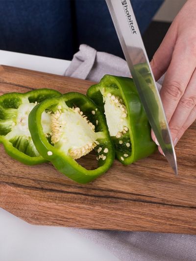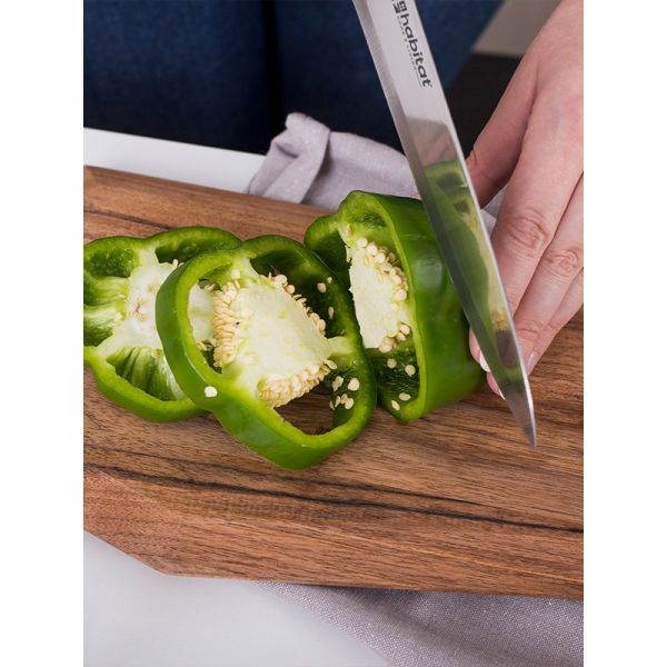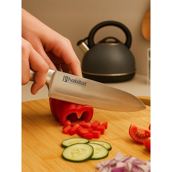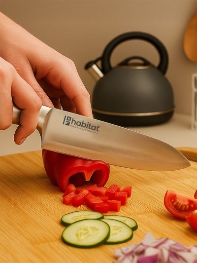 HABITAT 7" Santoku Knife is a professional-style multipurpose knife designed for effortless slicing, dicing, and mincing. The stainless steel blade ensures sharpness, durability, and precision, while its wide profile makes it excellent for scooping and transferring ingredients. Balanced and versatile, this Santoku knife is perfect for preparing vegetables, fruits, fish, and meats with ease. A must-have for home cooks and professionals alike, it brings efficiency and control to every kitchen task.