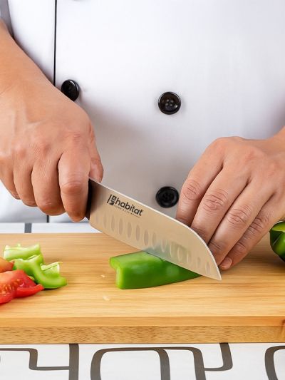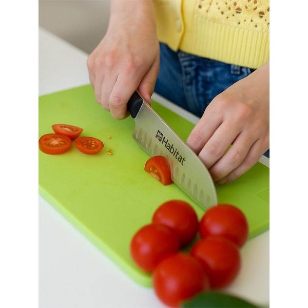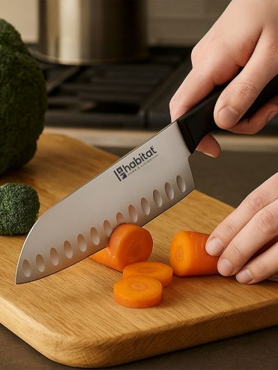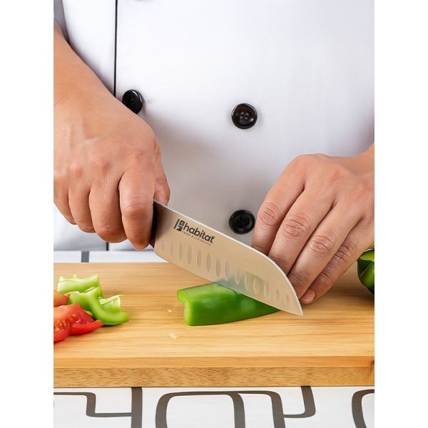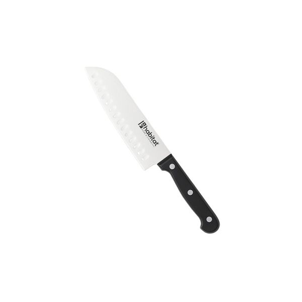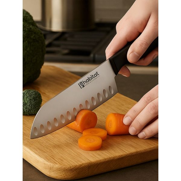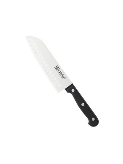 HABITAT 7" Santoku Knife with Bakelite Handle is a premium multipurpose knife, ideal for slicing, dicing, and mincing with precision. The  stainless steel blade delivers exceptional sharpness and durability, while its broad design makes it easy to scoop and transfer ingredients. The ergonomic Bakelite handle provides a comfortable, secure, and heat-resistant grip, combining style with functionality. Perfect for both home kitchens and professional use, this Santoku knife offers balance, efficiency, and long-lasting performance.