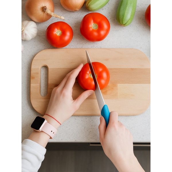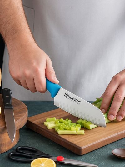 HABITAT 6" Santoku Knife with PP Handle is a versatile Japanese-style knife, perfect for slicing, dicing, and mincing with precision. The stainless steel blade features a sharp edge that glides easily through vegetables, fruits, and meats, making everyday prep quick and effortless. Its ergonomic polypropylene (PP) handle provides a secure, comfortable, and non-slip grip, ensuring safety and control during use. Durable, lightweight, and efficient, this Santoku knife is an essential tool for any modern kitchen.