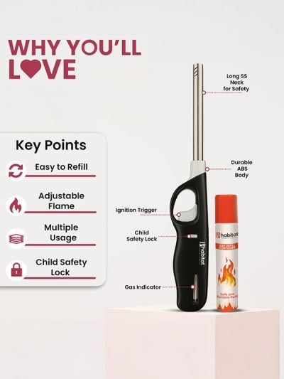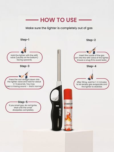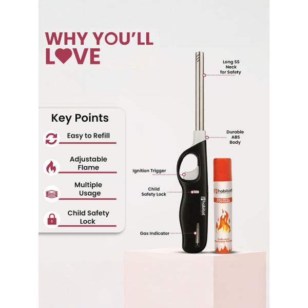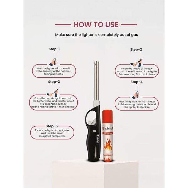 HABITAT Gas Lighter with Refill Can is a convenient and durable solution for safely igniting gas stoves, candles, and outdoor cooking setups. The refillable design ensures long-lasting use, while the ergonomic lighter provides a comfortable, secure, and non-slip grip. The included gas refill can adds extra convenience, making it practical and reliable for every kitchen and outdoor activity.