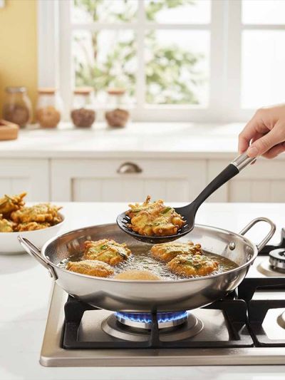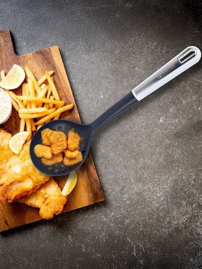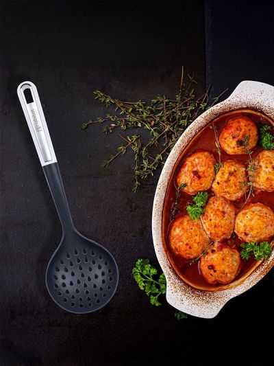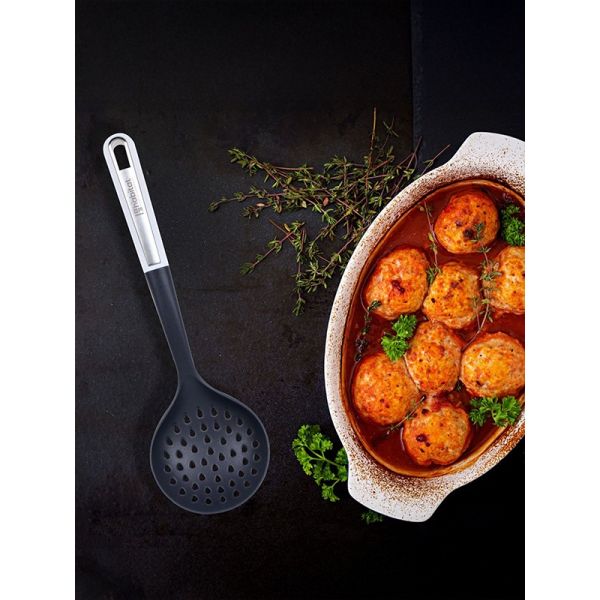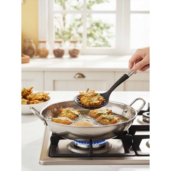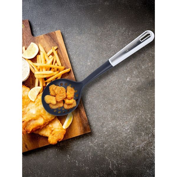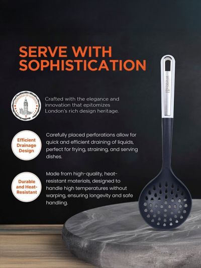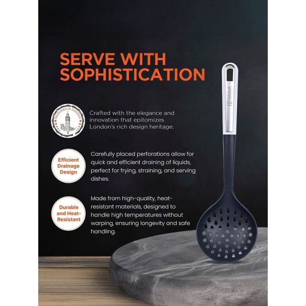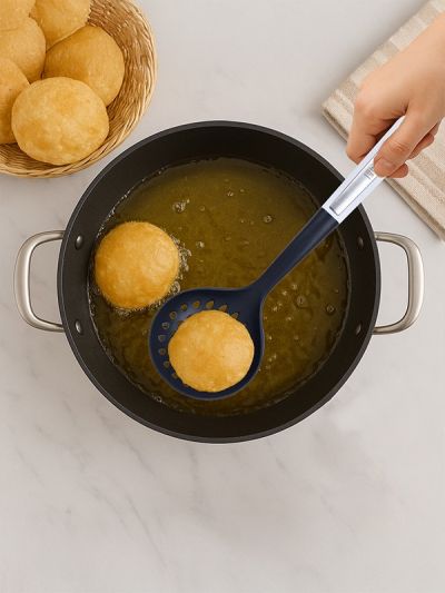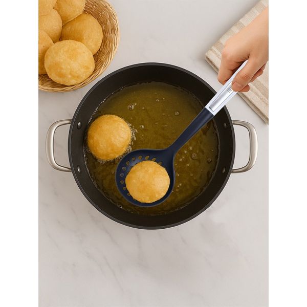 HABITAT Nylon Skimmer with SS Insert is a practical and versatile kitchen utensil designed for removing fried foods, blanching vegetables, and skimming liquids safely and efficiently. The nylon body is heat-resistant and safe for non-stick cookware, while the stainless steel (SS) insert adds strength and durability. Its ergonomic handle provides a comfortable, secure, and non-slip grip, ensuring safe and effortless use. Durable, functional, and reliable, this skimmer is an essential tool for every kitchen.