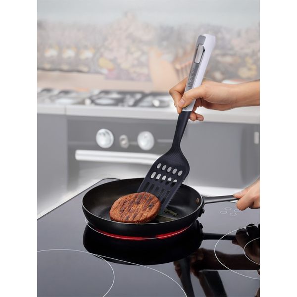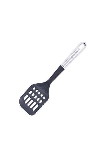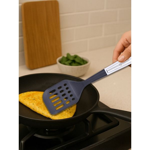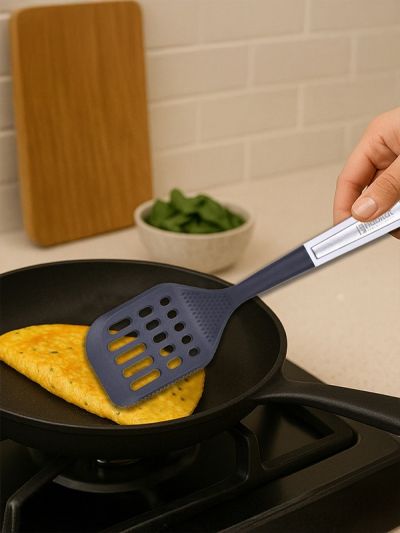 HABITAT Nylon Slotted Turner with SS Insert is a versatile kitchen utensil designed for flipping, turning, and serving foods like pancakes, burgers, and fried items. The nylon body is heat-resistant and safe for non-stick cookware, while the stainless steel (SS) insert provides added strength and durability. Its ergonomic handle ensures a comfortable, secure, and non-slip grip, making cooking efficient and safe. Durable, practical, and reliable, this slotted turner is an essential tool for every kitchen.