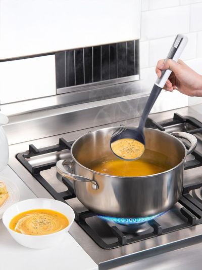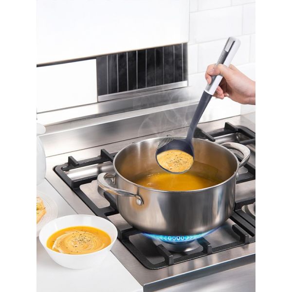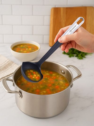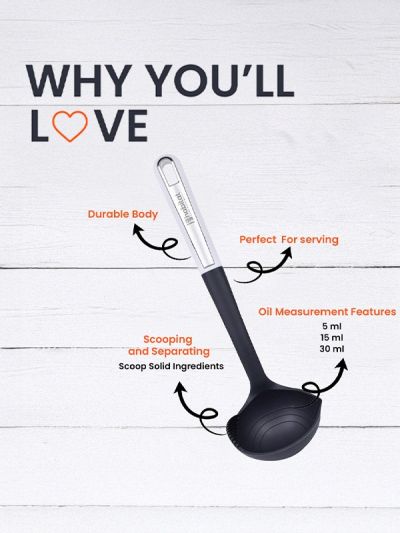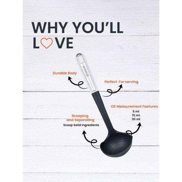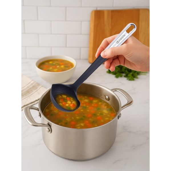HABITAT Nylon Soup Ladle with SS Insert is a durable and practical kitchen utensil designed for serving soups, stews, sauces, and other liquid dishes with ease. The nylon body is heat-resistant and safe for non-stick cookware, while the stainless steel (SS) insert provides added strength and durability. Its ergonomic handle ensures a comfortable, secure, and non-slip grip, making serving efficient and safe. Reliable, functional, and essential, this soup ladle is a must-have for every kitchen.